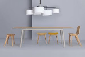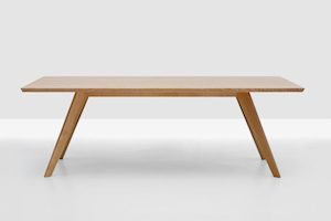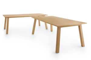Square or rectangular table. Solid wood frame. Tops in veneered panels with solid wood edges. Available in beech wood or oak...