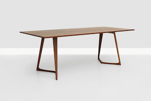 Round tables, dining or low, with base made in a single curved plywood element...
